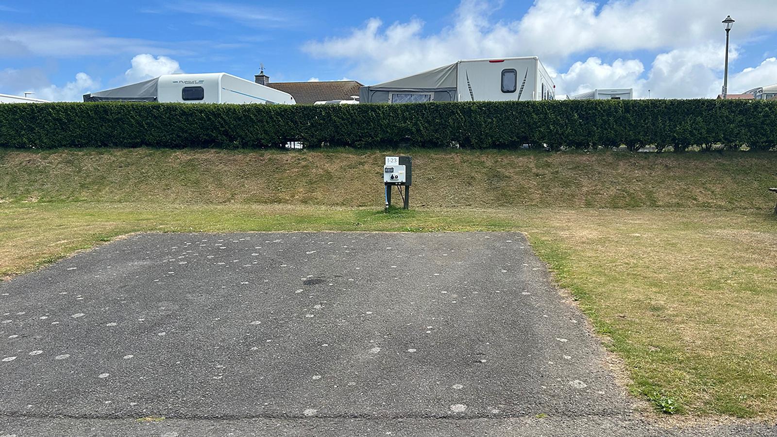 Electric seasonal pitch on hardstanding base with grass awning area including water connection and electric hook-up for £3,539 £3,359 per season + electricity (metered, charged as used).