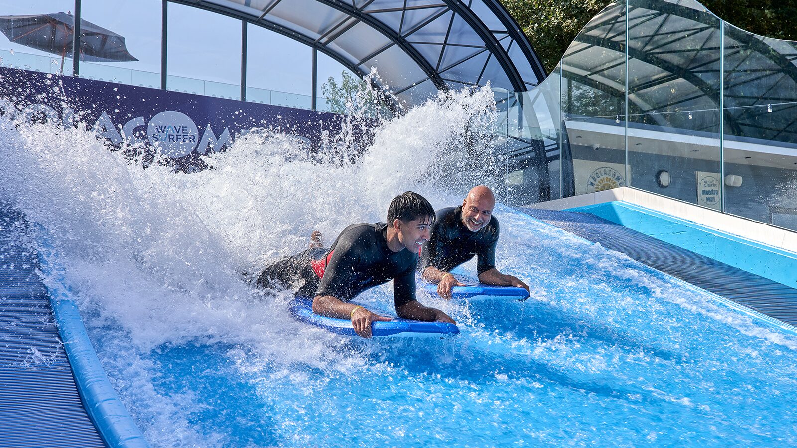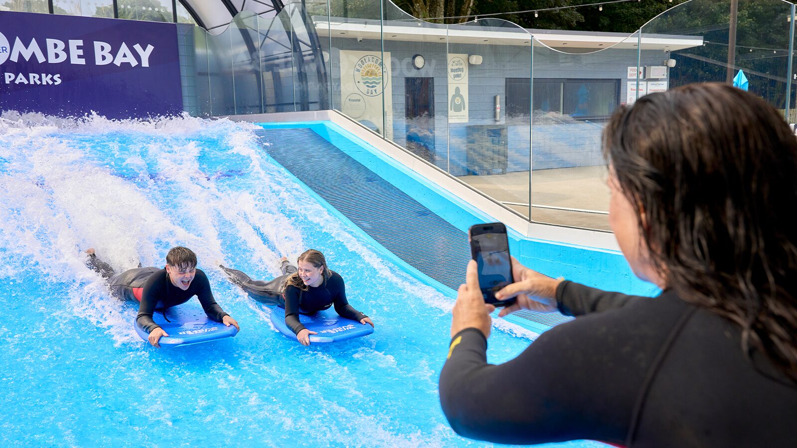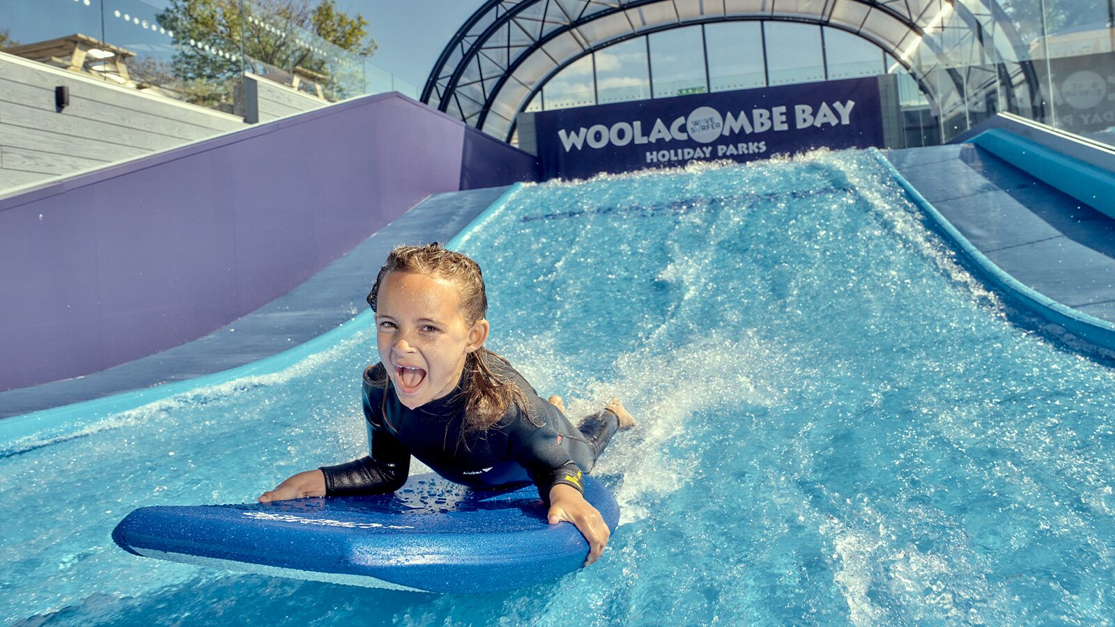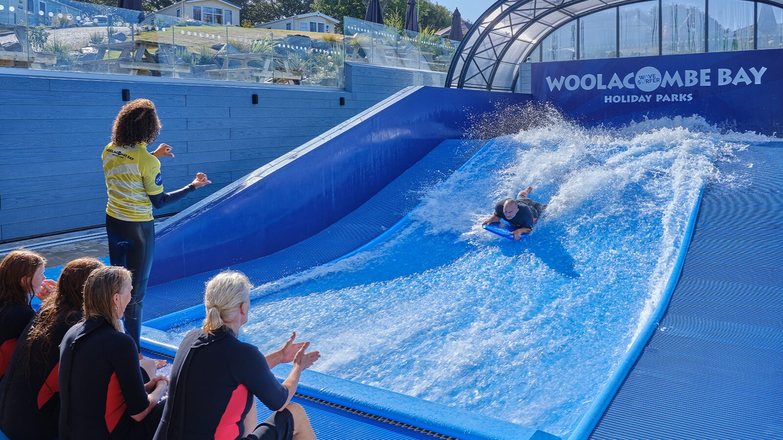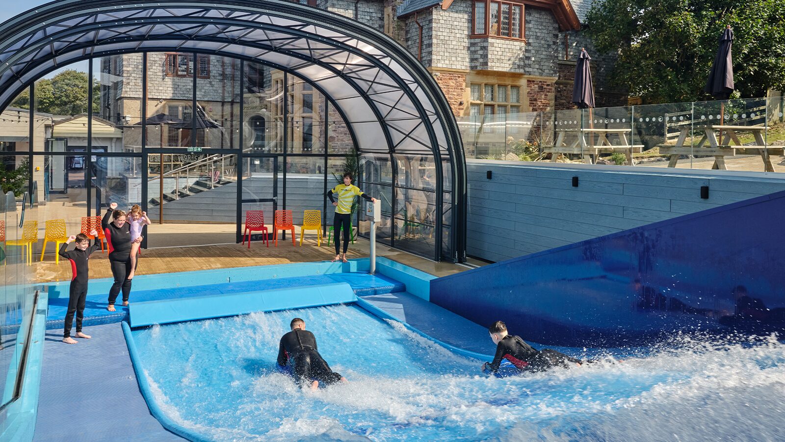 Did you know... this amazing feat of engineering shoots 60,000 litres of water over it's curved, padded surface every minute. It means if you're aged 8 to 80 and beyond you can have a go at surfing even if the surf at sea isn't quite right - even Britain's best beach has it's less good days. And because it's got a sliding roof and heated to 28-degrees like the Caribbean Sea it really is all-weather action guaranteed.