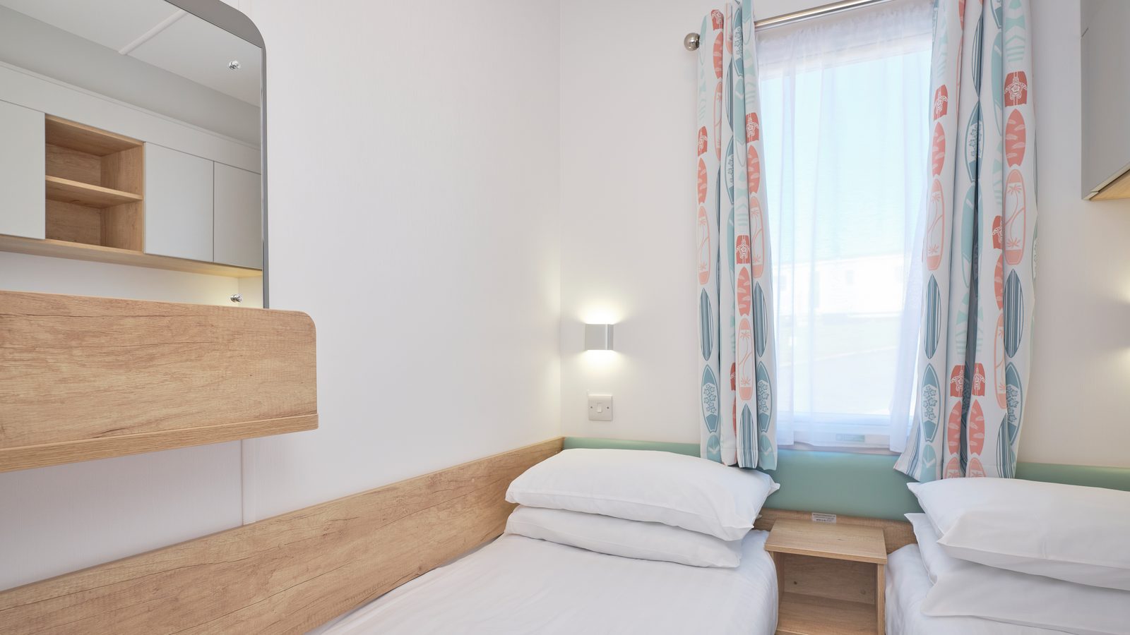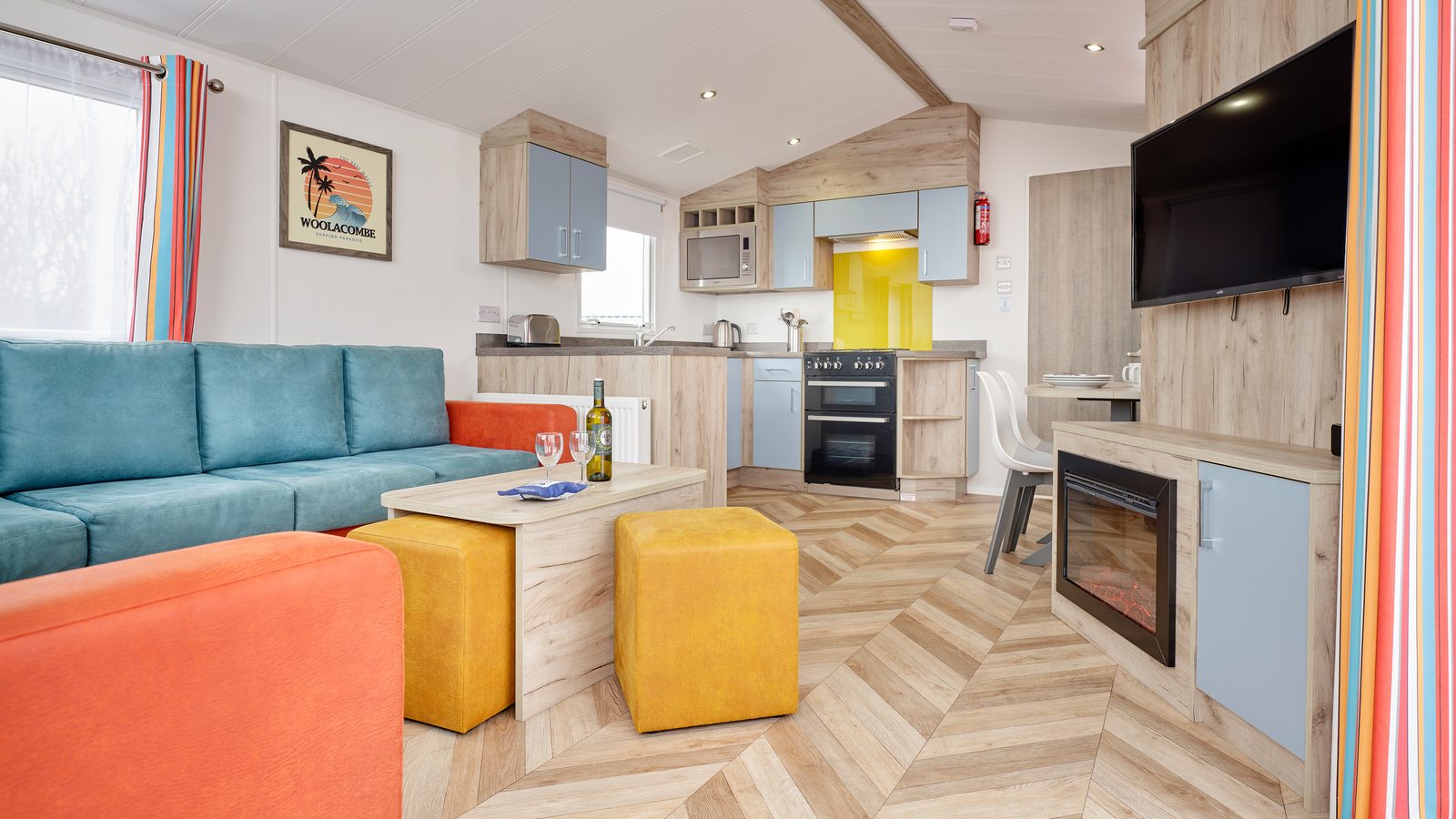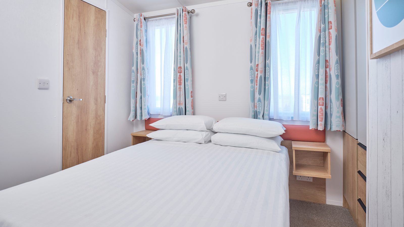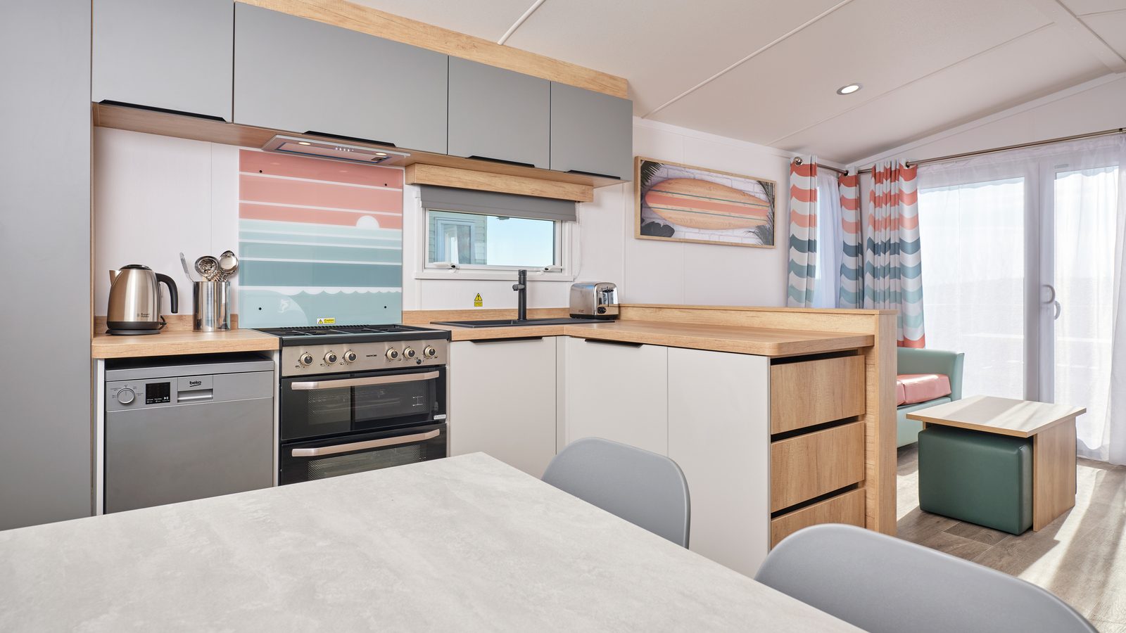 Superior 12ft wide surf-themed caravan sleeping up to 6 with one master double with Comfort Plus mattress and one twin (2’3” wide beds) and pull-out double sofa bed in the lounge. Spacious shower room and en-suite WC to the master bedroom. Contemporary open plan living space with full length windows, comfortable fitted seating area with 32” flat screen TV with DVD player, and separate dining area with table, fitted seating and stools. French doors lead onto enclosed decking area with picnic table. U-shape kitchen with freestanding ¾-size fridge-freezer. Centrally heated with double glazed windows throughout. Early check-in from 3pm.