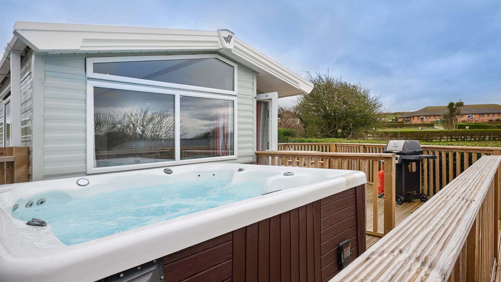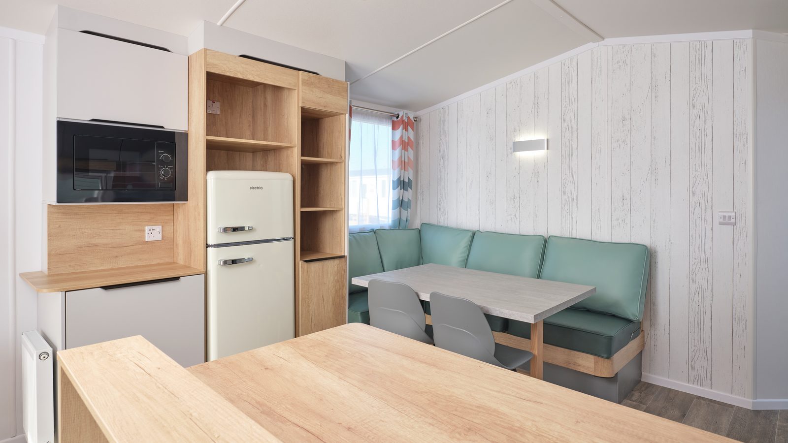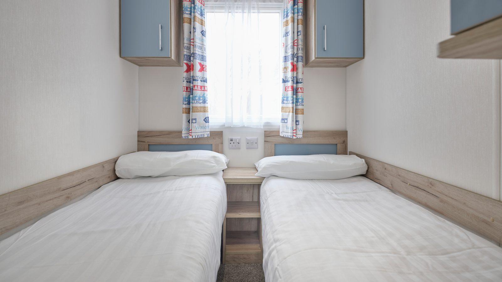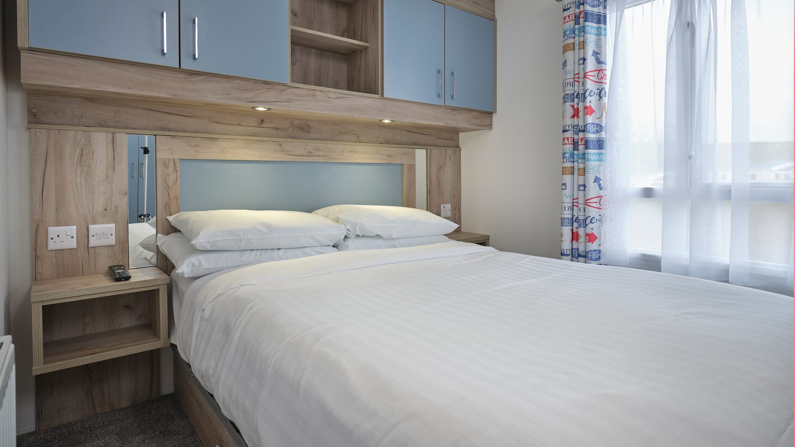 Superior 12ft wide surf-themed caravan sleeping up to 6 with one master double with Comfort Plus mattress and one twin (2’3” wide beds) and pull-out double sofa bed in the lounge. Spacious shower room and en-suite WC to the master bedroom. Contemporary open plan living space with full length windows, comfortable fitted seating area with 32” flat screen TV with DVD player, and separate dining area with table, fitted seating and stools. French doors lead onto enclosed decking area with picnic table. U-shape kitchen with freestanding ¾-size fridge-freezer. Centrally heated with double glazed windows throughout. Early check-in from 3pm.