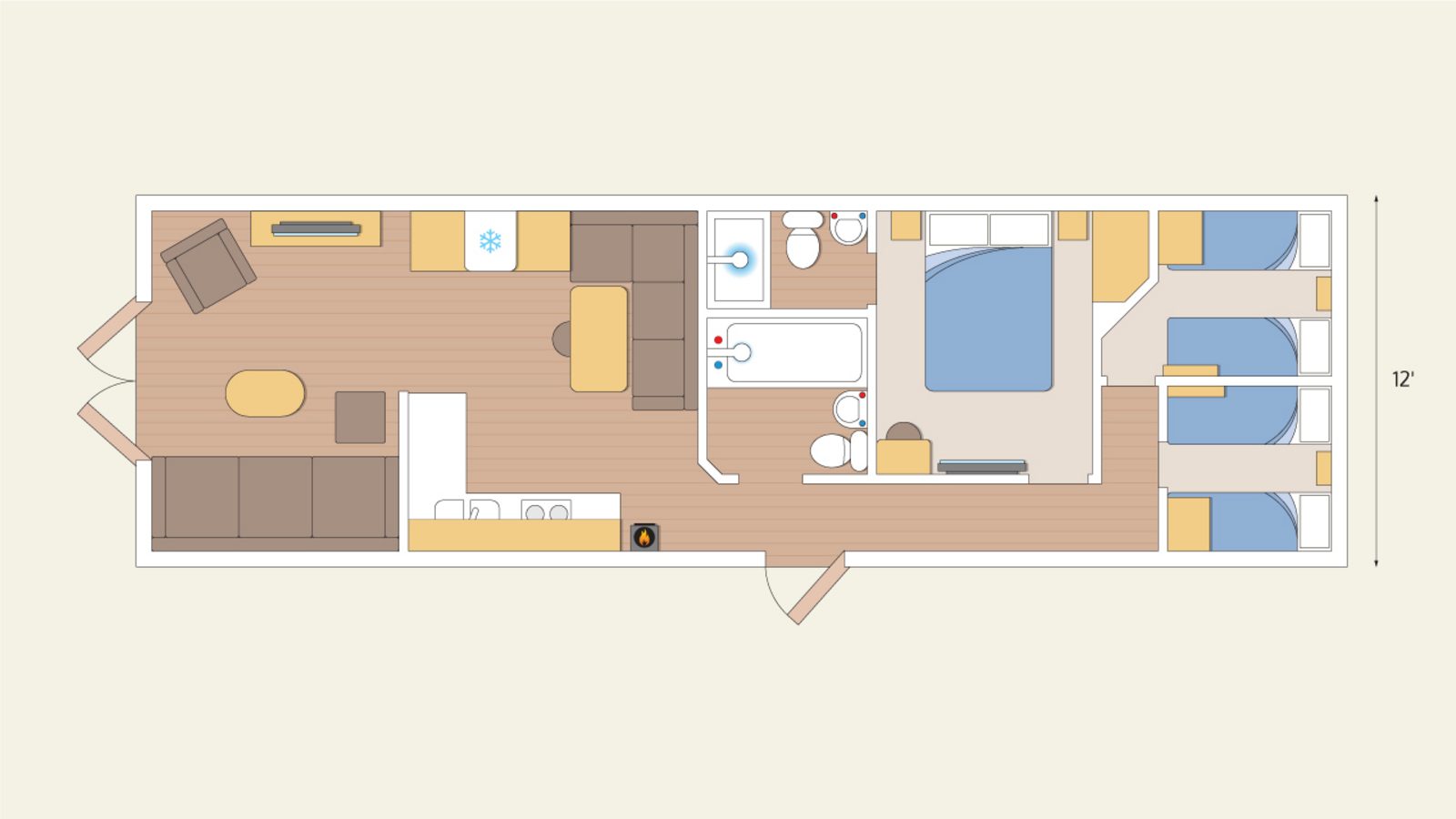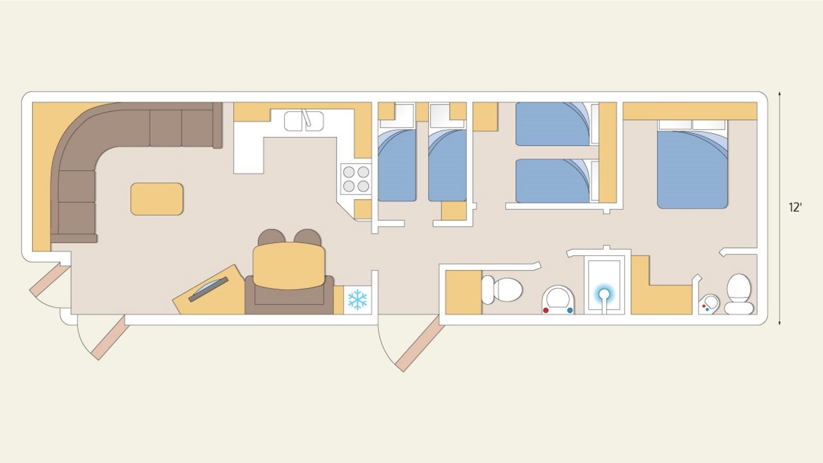 Maximum capacity includes use of the pull-out double bed in the lounge.Images and layout plans are for guidance purposes only to show the range of accommodation available. There are a number of varying models within each range and both the interior design and fittings are dependent on the model and manufacturer. The flooring within accommodation will be carpet in the bedrooms and lino in all remaining rooms. All accommodation is accessed by steps.
