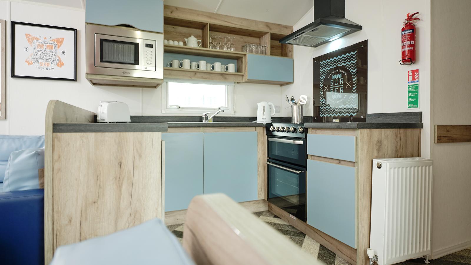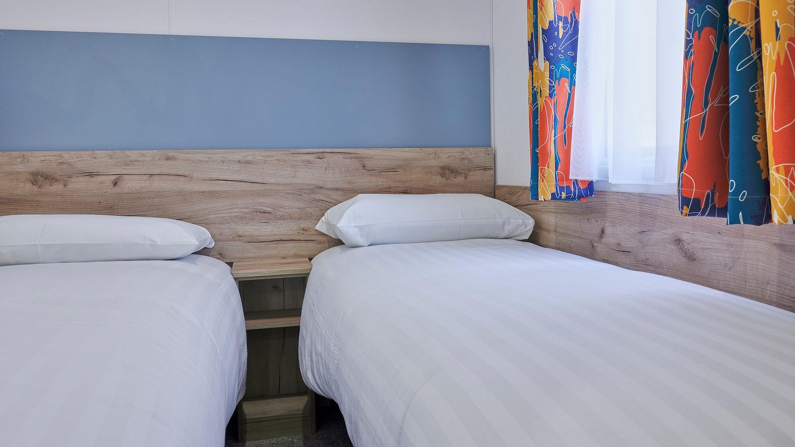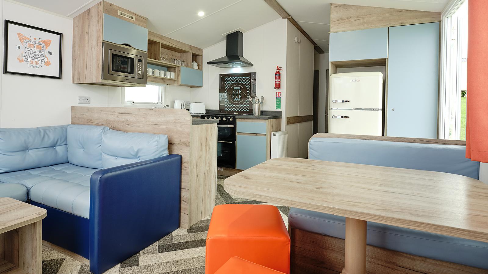 Compact 12ft wide surf-themed compact caravan sleeping up to 6 with one master double with Comfort Plus mattress and one twin (2’3” wide beds). Compact shower room. Open plan living area featuring a dining table as part of the fitted lounge seating space and 32” flat screen TV. Galley kitchen with freestanding ¾-size fridge-freezer. Centrally heated with double glazed windows throughout. Check-in from 5pm.