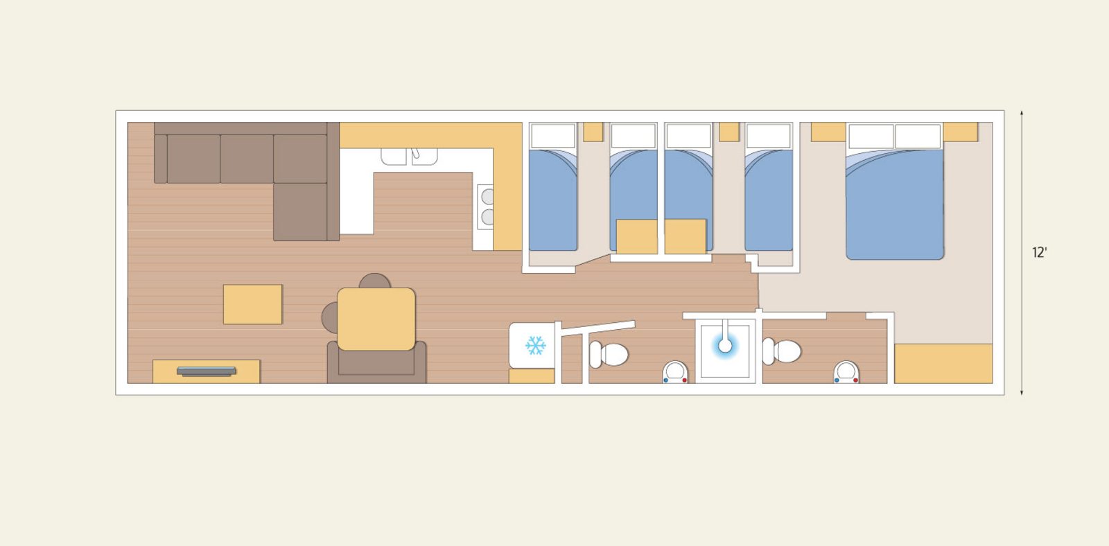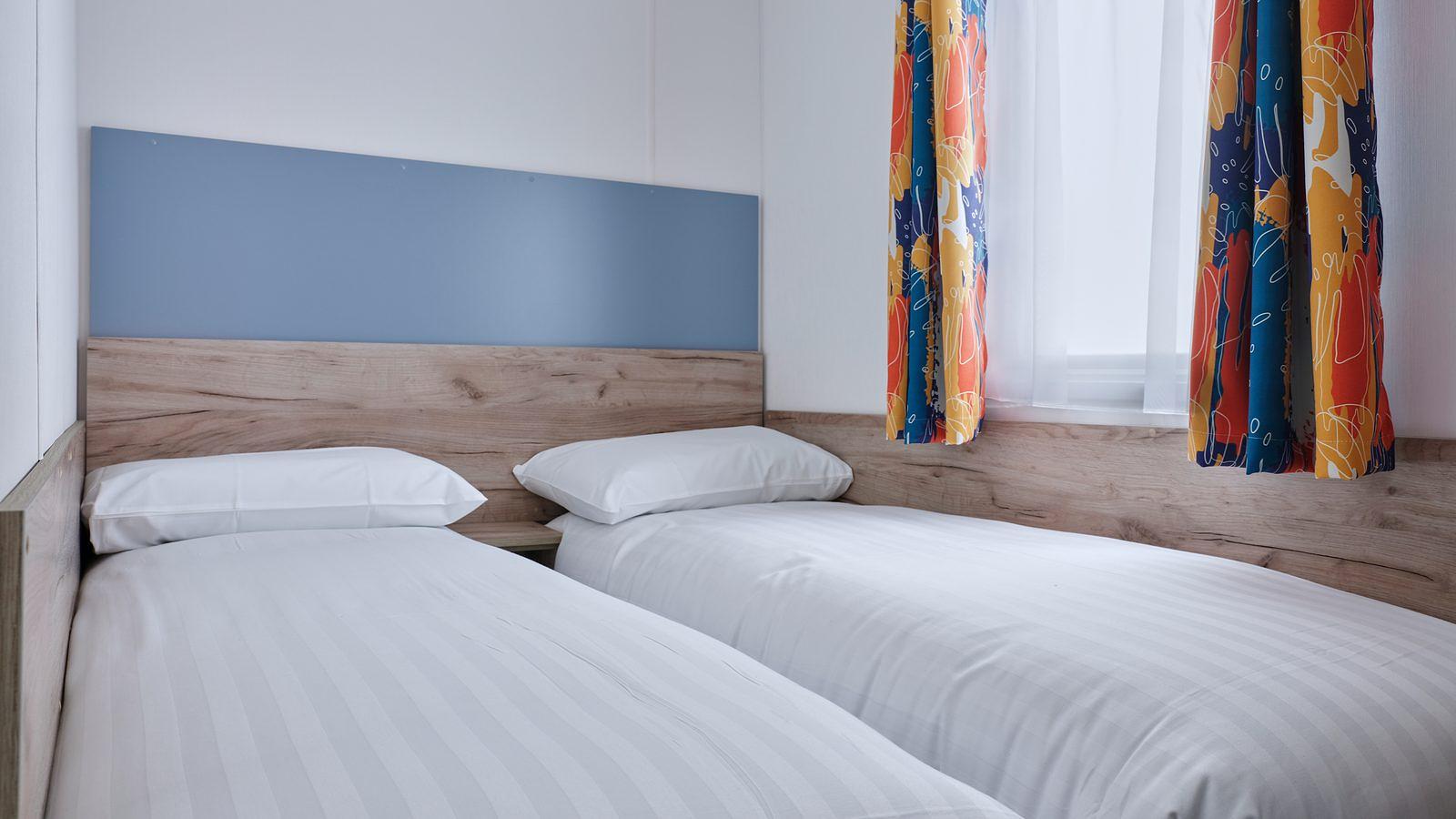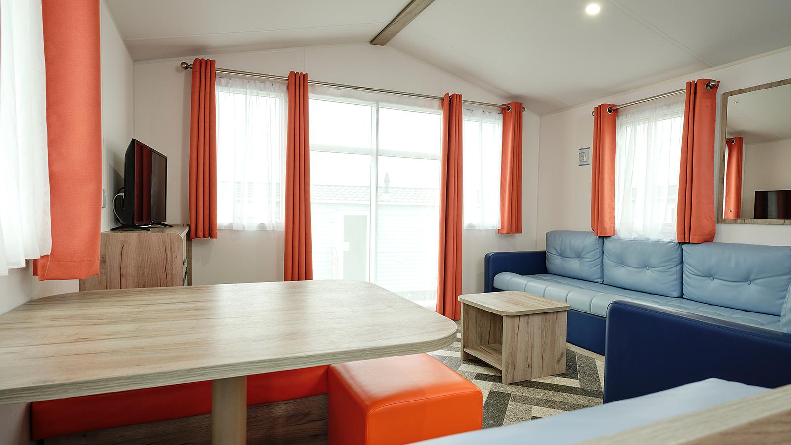 Compact 12ft wide surf-themed compact caravan sleeping up to 6 with one master double with Comfort Plus mattress and one twin (2’3” wide beds). Compact shower room. Open plan living area featuring a dining table as part of the fitted lounge seating space and 32” flat screen TV. Galley kitchen with freestanding ¾-size fridge-freezer. Centrally heated with double glazed windows throughout. Check-in from 5pm.